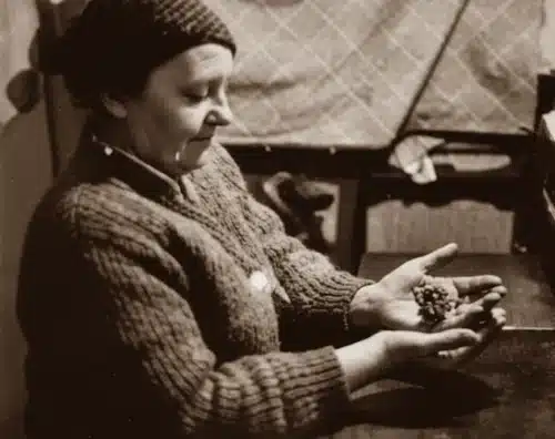 Britta Lena Andersson tre veckor före hennes död, hösten 1904. Här tar hon emot dagens post från hjälpsökande utanför hemmet i Hambrö